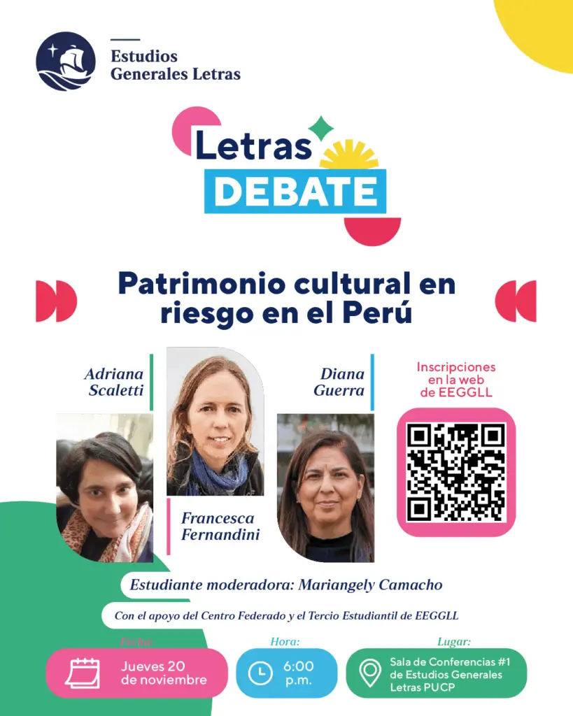 “Letras Debate”, que cuenta con el apoyo del Centro Federado y Tercio Estudiantil de EEGGLL está planteado como mesas de diálogo en el que puedan participar nuestros estudiantes como moderadores y como público asistente, que reflexiona e interpela sobre diversas temáticas. En esta ocasión, presentamos la sexta mesa de diálogo sobre el «Patrimonio cultural en riesgo en el Perú».