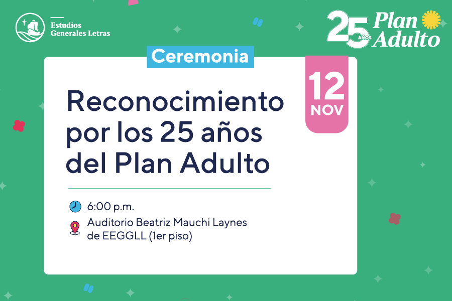 La Facultad de Estudios Generales Letras y la Coordinación Académica del Plan Adulto organizan la ceremonia “Reconocimiento por los 25 años del Plan Adulto”, que se llevará a cabo el miércoles 12 de noviembre de 2025, a las 6:00 p.m., en el Auditorio “Beatriz Maucchi Laynes” de Estudios Generales Letras, en el campus universitario.